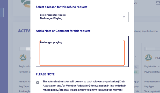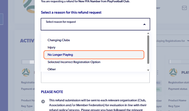 Your refund request now needs to be acknowledged by all organisation levels prior to you receiving funds back (your club, association, member federation and Football Australia). Once acknowledged, the refund will be processed by Football Australia.