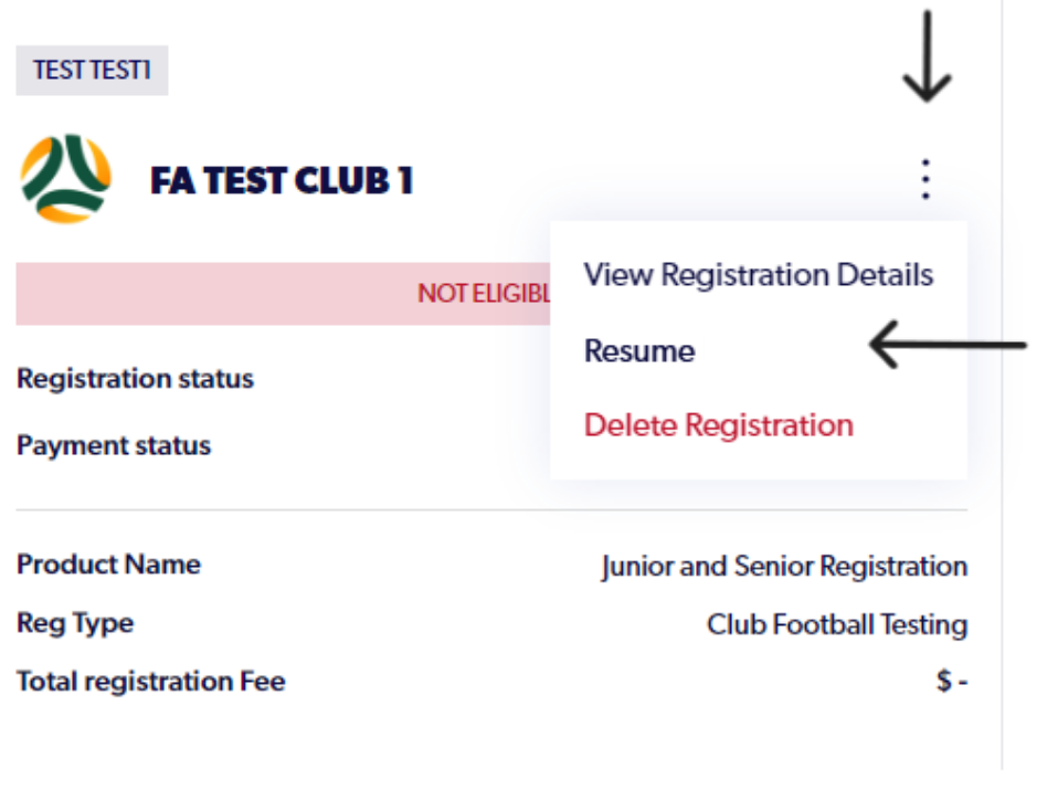 4. Click on the 3 dots of your registration and select 'Resume'
