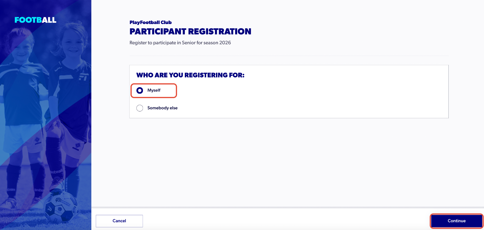 7. Select the person who is being registered and select ‘Continue’ and the bottom of the page.