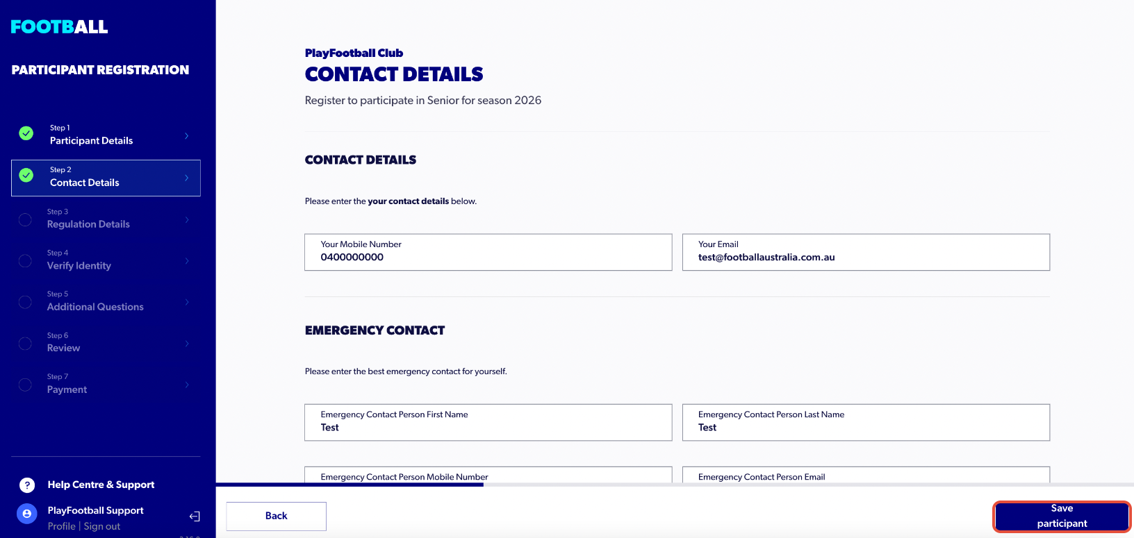 10. Continue with the contact details and select ‘Save Participant’ at the bottom of the page.