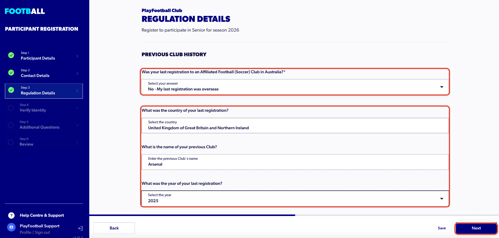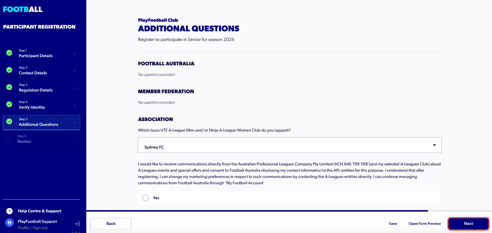 13. If your club has any additional questions, fill them out and select ‘Next’ at the bottom of the screen.