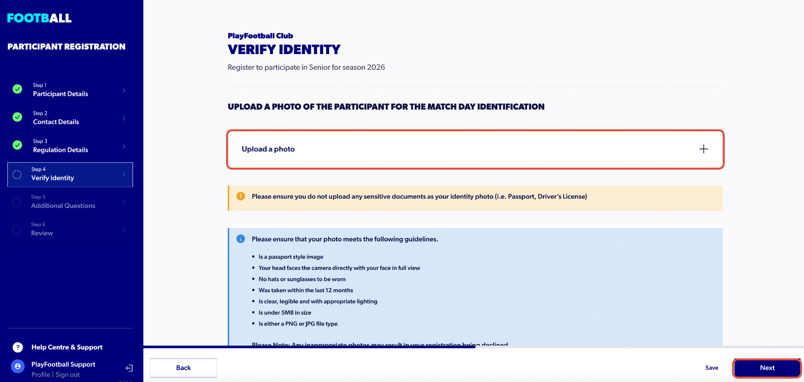 12. Upload a photo of the participant for match day identification.