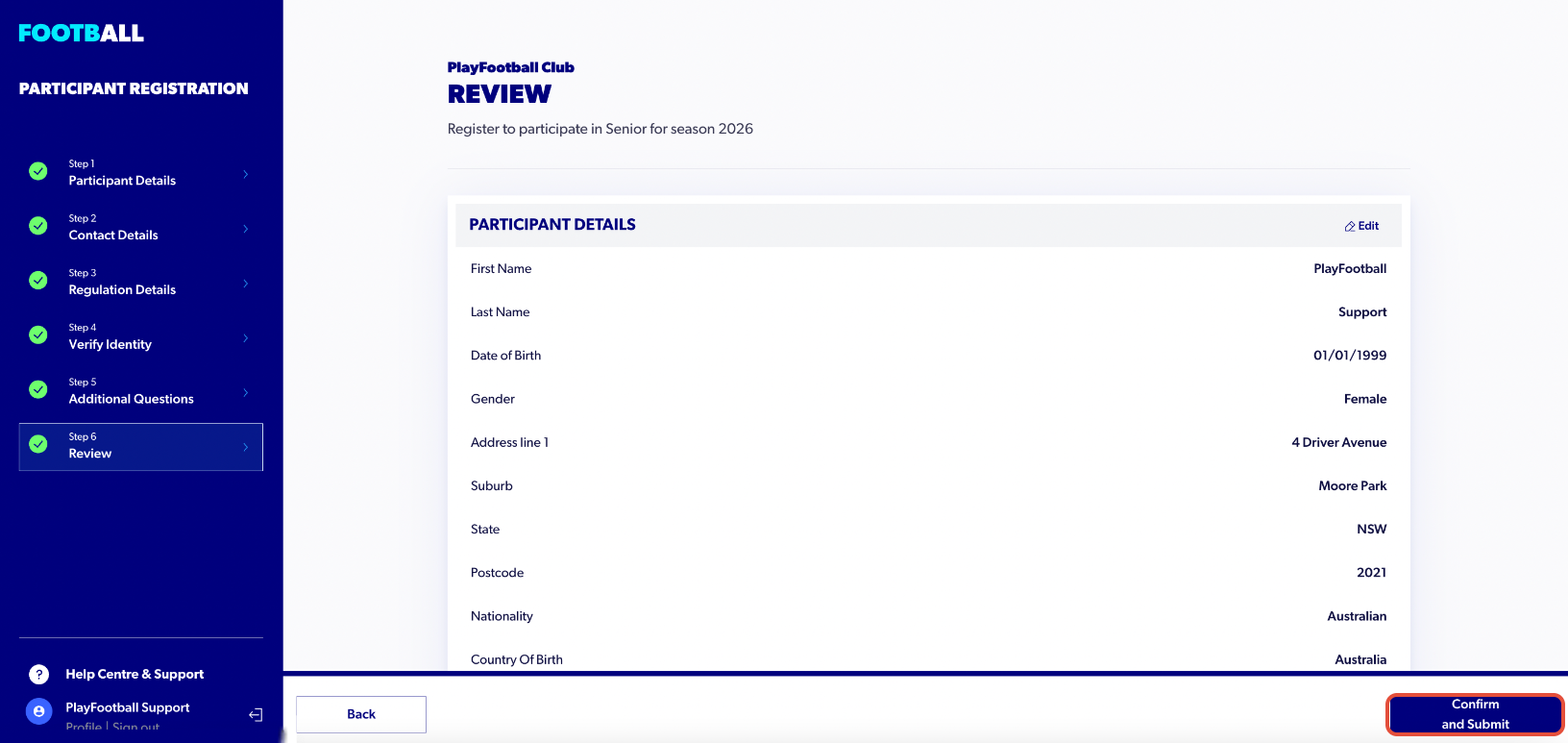 14. Review the details of your registration and select ‘Confirm and Submit’ at the bottom of the page.